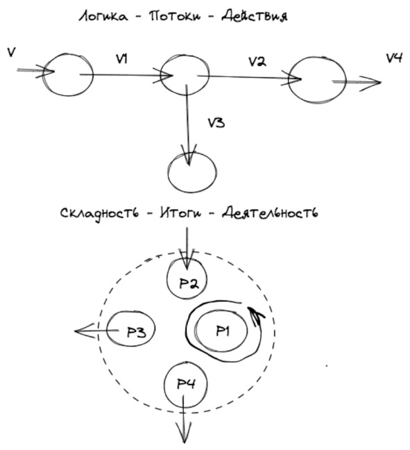 На все, что происходит в нашем мире, мы можем смотреть как на процессы, а на все, что мы можем назвать процессом, мы можем наложить схему складности, в которой процесс будет, с одной стороны, одной из частей чего-то большего, с с другой стороны – вместилищем для четырёх процессов, его составляющих.