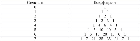 Где коэффициенты k (биноминальные коэффициенты) определяются из треугольника Паскаля.
