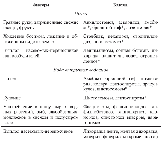 Почва. Распространение многих инфекционных болезней в тропиках тесно связано с почвой. Например, возбудители геогельминтозов, проходят в ней обязательную фазу развития. Значение почвы в распространении указанных инвазий особенно велико в земледельческих районах. Загрязнение почвы возбудителями геогельминтозов происходит повсеместно, однако наиболее интенсивно в тех районах, где отсутствует канализация и распространен обычай удобрять почву человеческими экскрементами. Заражение людей обусловлено постоянным контактом голых рук и ног с почвой и водой во время работы на орошаемых полях, а также употреблением свежих овощей и трав, выращенных на заливных огородах. В почве тропиков происходит выплод различных видов насекомых-переносчиков болезней: мухи цеце (сонная болезнь), москиты (лейшманиоз) и др. Влияние почвы и воды на распространение инфекций и инвазий в тропиках представлено в табл. 1.
