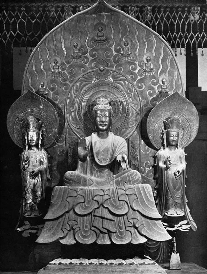 Триада Шакьямуни, бронза, высота центральной фигуры 86,3 см, предстоящих 91 см, 623 г., Кондо, храм Хорюдзи, Нара