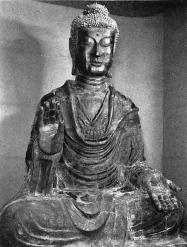 Японская буддийская скульптура по данным, зафиксированным в «Анналах Японии» («Нихон секи», 720), восходит к первым буддийским изображениям из бронзы, посланным в 552 г. (по другой версии в 538 г.) правителем (ваном) корейского государства Пэкче[16] японскому императору Киммэй[17] (539–571), который, как сказано в «Анналах», в восторге произнес: «Ослепителен облик Будды, преподнесенного нам соседней страной на Западе. Такого у нас еще не было…» (Мещеряков А. Н., Грачев М. В. История древней Японии. С. 147). Спустя 25 лет правитель Пэкче отправил в Японию группу монахов, монахинь, строителей и скульпторов. Через порт Нанива (Осака), куда из Асука переехал двор императора Котоку (прав. 645–654), стали осуществляться контакты японцев с внешним буддийским миром. В результате пропаганды буддийского вероучения его откровенный сторонник Главный министр (ома, глава вождей) Сога но Инамэ на своей территории построил первую часовню. Когда в 584 г. император Бидацу (572–585) получил из Кореи статую Мироку, он вверил ее заботам сына Инамэ – великого оми Сога но Умако (?-626). Следуя примеру своего отца, Умако построил для статуи часовню с восточной стороны своего дома и приставил к ней трех китайских монахинь, одна из которых была одиннадцатилетней дочерью иммигранта Сиба Татто (Датито) (вариант известной китайской фамилии Сыма), тесно связанного с Умако общим делом по распространению буддизма в Японии. Ни часовня Умако, ни пагода, построенная Сиба Татто, не считались полноценными буддийскими храмами, хотя их роль в небольшом тогда буддийском мире Японии, несомненно, была заметна. Бесспорно, буддизм нашел в лице представителей клана Сога активных сторонников и проводников континентальной религии. Можно предположить, что именно с 584 г. идет официальная история буддизма в Японии, поскольку в «Анналах» есть следующая запись: «Закон Будды ведет начало в Ямато (древнее название Японии. – Ю. К.) с этих пор» (Там же. С. 149).