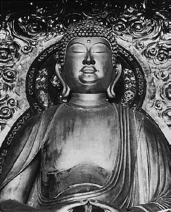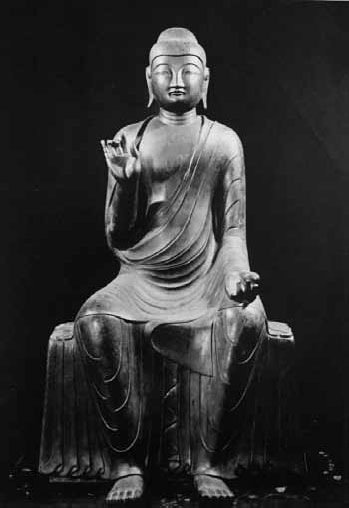 Галерею Будд, созданных в период Асука, замыкает скульптура Шакьямуни в необычной для японской традиции позе: обе массивные ноги с широкими ступнями опущены, он сидит на скамейке, задрапированной тканью с вертикальными складками, заканчивающимися фестончатым рисунком. Правая рука Будды приподнята ладонью наружу в мудре сэмуиин, левая ладонью вверх покоится на колене. Поэтому его даже пытались идентифицировать с Мироку или целителем Якуси: предполагалось, что он мог держать горшочек со снадобьем. Взгляд Будды не отрешенный, а скорее, сосредоточенный, углубленный в себя. Длинное одеяние-плащ, задрапированное параллельными складками, не лишает силуэт формы, наоборот, оно изящно обрисовывает ноги и руки. Скульптор отходит от плоскостного изображения, сообщая фигуре некоторую объемность. Будда уже интересен не как компонент, хотя и основной, классической Триады, а как самостоятельный образ, несущий всю смысловую нагрузку: в его облике превалирует божественное спокойствие, даже интимность, а не отрешенность и изолированность от окружающего мира. Несущий и черты архаики Тори, и танскую иконографию (618–907), этот образ Будды из Дзиндайдзи знаменует появление местных традиций в ваянии. Стиль Тори обнаруживается в полуопущенных веках и рисунке носа с широкими крыльями, переходящими в арочные брови, а также в ямочке над пухлой верхней губой. Правда, вопрос о том, что данная скульптура изображает исторического Будду, остается открытым. Идентичная фигура Шакьямуни, но в три раза меньше хранится в Токийском национальном музее. Если и есть различия, то они касаются взгляда: у миниатюрного Будды он несколько детский, кроме того, у него рельефно выявлена мускулатура торса, вычеканены складки низа одежды.