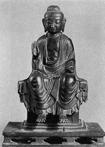 Будда на скамейке, втор. пол. VII в., бронза, 28,7 см, Национальный музей, Токио