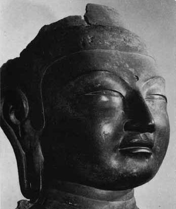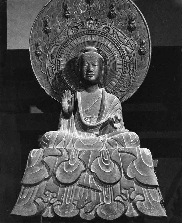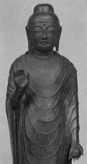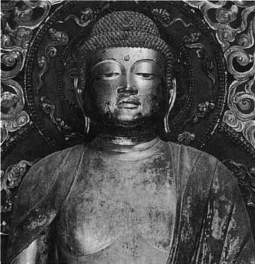 Считается, что в целом образцом для создания Шакьямуни из Триады явилась китайская каменная скульптура (523 г.) из пещеры Биньян в Лунмэне,[32] а предстоящих – фигуры бодхисаттв, находящиеся сейчас во дворце Токсу в Сеуле (бронза, вторая половина VI в., 15,1 см). Так называемый лунмэнский стиль Северной Вэй, пришедший в Японию в начале VII в., оказал существенное влияние на формирование асукской пластики. Тем не менее некоторые детали, например, прически с мелко завитыми волосами, говорят о воздействии больше корейского стиля, нежели китайской пещерной скульптуры. Небольшое различие между китайским прототипом и японским Шакьямуни наблюдается в мудре левой руки ёганъин: у Шакьямуни из Хорюдзи выдвинуты указательный и средний пальцы, а не только указательный. Скорей всего, мудра тоже заимствована из корейской скульптурной традиции и означает исполнение желаний, дарование спасения. Перепонки между длинными пальцами (и то и другое относится к 32 признакам Будды сюсокусимаммосо) означают, что большое количество людей попадают под покров Будды. Асукские скульптуры, подражая континентальным образцам, вносили в формирование облика Будды, в частности, в его одеяние национальные особенности. Например, каскадная драпировка юбки с широкими складками отличается от более дробной, мелкой, присущей лунмэнскому стилю. Различия касаются и декора мандорлы, которая, в целом, соответствует китайскому источнику, но в японском варианте присутствует кольцо из полусферических драгоценностей, которое было характерно для мандорл будд из китайской пещеры Гуян (495 г.), но в поздних нимбах не встречается. Главное, в трактовке облика Будды приходит новое понимание его роли в жизни людей. Во взгляде божества уже нет призыва к аскетизму, строгости, но выявляется мягкость и духовная связь с окружающим миром. Скульптура освобождается от жесткости торса и скованности движений, наоборот, благодаря плавным изгибам конечностей, текучести линий тела, выдержке пропорций, она приближается к реальной уравновешенной фигуре. Большое внимание придается пышному, торжественному одеянию, красивые симметричные складки которого прочеканены в невысоком рельефе.