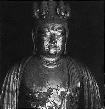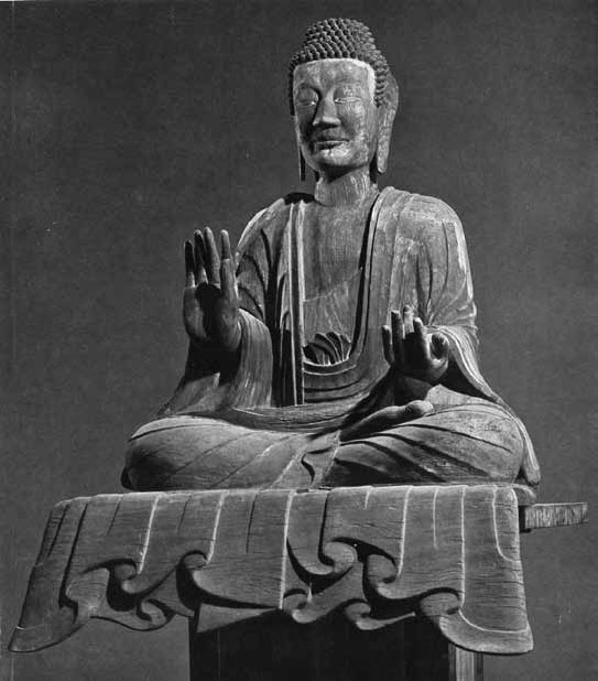 Вторым значительным изображением Якуси считается Якуси из храма Хориндзи, где будда-целитель выполняет роль основной святыни. Выточенный из дерева по позе, положению рук, пальцы которых сплетены в мудре анъиин (правая рука поднята кверху, пальцы вытянуты, открытой ладонью обращена к молящимся, а пальцы левой руки как будто собраны в пригоршню; она еще корреспондирует с мудрой проповеди Закона – сэппоин), а также по крою одеяния он только в некоторых деталях отличается от бронзового Якуси. Основное различие, которое бросается в глаза, состоит в моделировке лица: вытянутое у деревянного Якуси оно напоминает лики ангелоподобных музыкантов на бронзовых стягах кандзёбан[35] в Кондо храма Хорюдзи. Разнятся они и прическами: у Якуси Хориндзи на голове «шиньон» из мелко закрученных волос, а не обычный, туго стянутый пучок. Кроме того, юбка деревянного Якуси Хориндзи, ниспадающая на пьедестал, выглядит значительно скромней, чем у бронзового варианта, впрочем, как и вся скульптура, возможно, из-за отсутствия мандорлы, которая, бесспорно, украшает Якуси Хорюдзи. Якуси восседает на пьедестале нидзюсэннодзидза. Некоторая тяжеловесность фигуры роднит эту скульптуру с изображениями будд, относящихся к школе Тори. Но заметны и различия: четко намечена линия верхнего века, плотно сжаты губы, отсутствует архаичная улыбка. К тому же есть признаки нарушения симметрии, как в самой фигуре, так и в рисунке одеяния, которая строго соблюдалась в работах Тори и его учеников, а также в скульптурах Гудзэ Каннон и Кудара Каннон (о них речь далее).