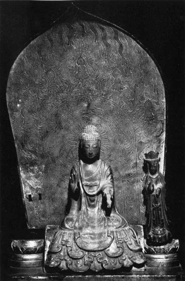 Триада Босинэн Шакьямуни, бронза, высота Шакьямуни 16,5 см, 628 г., Сокровищница храма Хорюдзи (сохранился левый предстоящий)