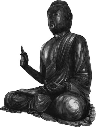 Обычно фигура сидящего Будды, изображенная в состоянии покоя и расслабленности, являет пример канонизированных черт лица, поз и жестов как нечто постоянное. Японская иконографическая система восприняла континентальный тип Будды, застывшего в бесстрастной созерцательности (дзэндзё но Сяка). Неподвижная монументальная поза (китидзёдза) сидящего Будды с вывернутыми наружу пятками – правая нога как символ Будды и Учения лежит на левой, олицетворяющей мир, – оживляется разнообразными положениями ладоней и пальцев рук (пример тому скульптура из храма Рёдзэндзи на о. Сикоку). Такое положение скрещенных ног возможно благодаря тому, что ступни Будды имеют высокий подъем, который сравнивают с круглым панцирем черепахи (сокуфукомансо), что является одним из тридцати двух телесных признаков. Асана созерцания (дхьяна асана, другое название «поза лотоса») передает медитативную сосредоточенность, во время которой стирается противоречие между внутренним и внешним мирами, индивидуальное сливается с космическим. Уравновешенность композиции свидетельствует о духовной и физической гармонии божества. Широкие плечи[33] и довольно узкая талия придают телу Будды, как уже говорилось, сходство с царем зверей – львом, славящимся силой и бесстрашием. Молодое лицо, озаренное застывшей архаичной улыбкой, не подвластно времени. Его особая проработка, вскинутые дугообразные брови в форме лунного серпа, царственный изгиб крыльев носа, лучащиеся глаза, подобные бутонам лотоса, – все подчеркивает одухотворенность изображения, глубоко воздействующего на молящихся. От тела Будды исходит сияние кондзикисо, один из физических признаков Будды, относящийся к телу синтай.