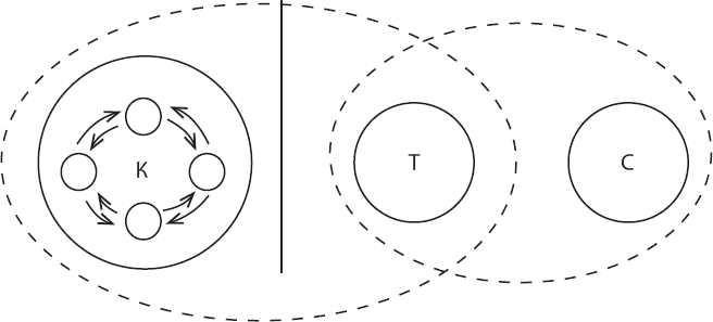 Рис. 1. Составляющие супервизионной системы, где: 1. К – семейная система; 2. Т – терапевт(-ы) – супервизант(-ы); 3. С – супервизор(-ы)