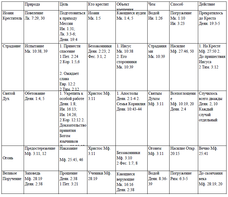 4) Крещение огнем – Крещение огнем будет установлено Христом в качестве наказания за грехи во время последнего суда. В Мф. 3:12 указывается, что крещение огнем – это ад. В наше время не все исследователи Библии согласны с преподнесением этого стиха в Евангелии от Матфея и полагают, что крещение огнем – нечто такое, что необходимо христианам в наше время; и они молятся за крещение огнем. По мнению автора данной книги, эта молитва основана на заблуждении, и будет страшно, если Господь ответит на эти молитвы. Ввиду того, что нечтопохожее на огонь появилось перед апостолами в день Пятидесятницы, некоторые специалисты предположили, что «крещение Святым Духом и огнем» было именно тем, что случилось в праздник Пятидесятницы но подобное толкование не учитывает собственного объяснения, данного Иоанном Крестителем «крещению огнем» в Мф. 3:12. Иоанн разъяснял слушателям, что некоторые из них будут крещены Святым Духом, а некоторые – огнем, ввиду неприятия проповедуемых им идеалов и Того, Который идет за ним. Можно ли в наше время креститься огнем? Да, можно. Все грешники будут низвергнуты в огненное озеро, если не покаются и не обратятся к Христу.