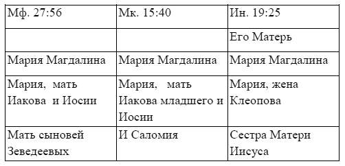 Приводимое ниже перечисление женщин, наблюдавших за распятием Иисуса, будет иметь отношение к ответу на этот вопрос.