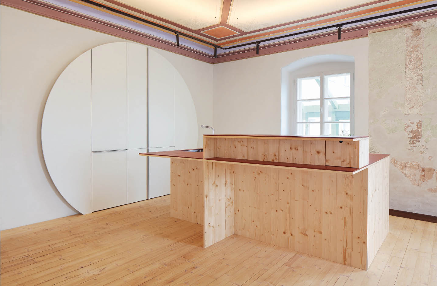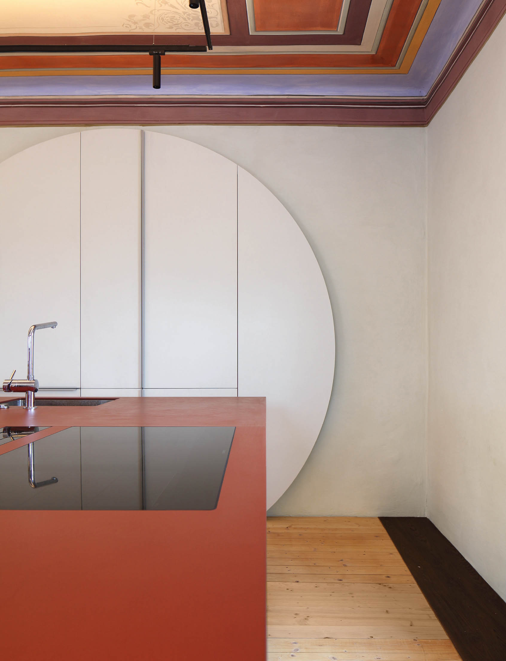 Die frei in den Raum positionierte Küche greift mit ihrer roten Arbeitsplatte die Farbigkeit der historisch nachvollzogenen Deckenbemalung auf.