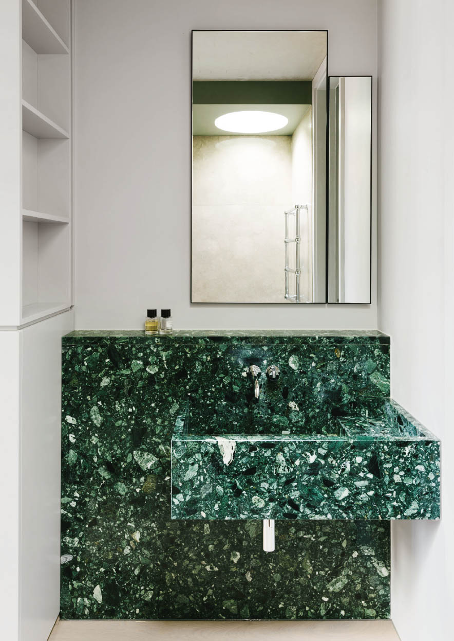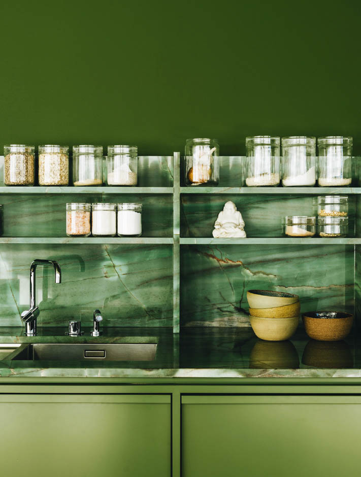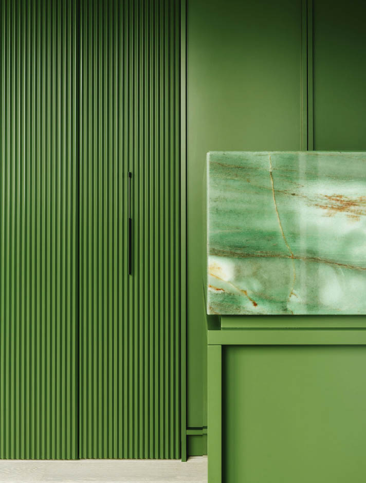 Eine der Boxenwände beherbergt die Küche. Der grüne Naturstein greift für ein maximales Maß an Understatement das Grün der Lackierung auf.