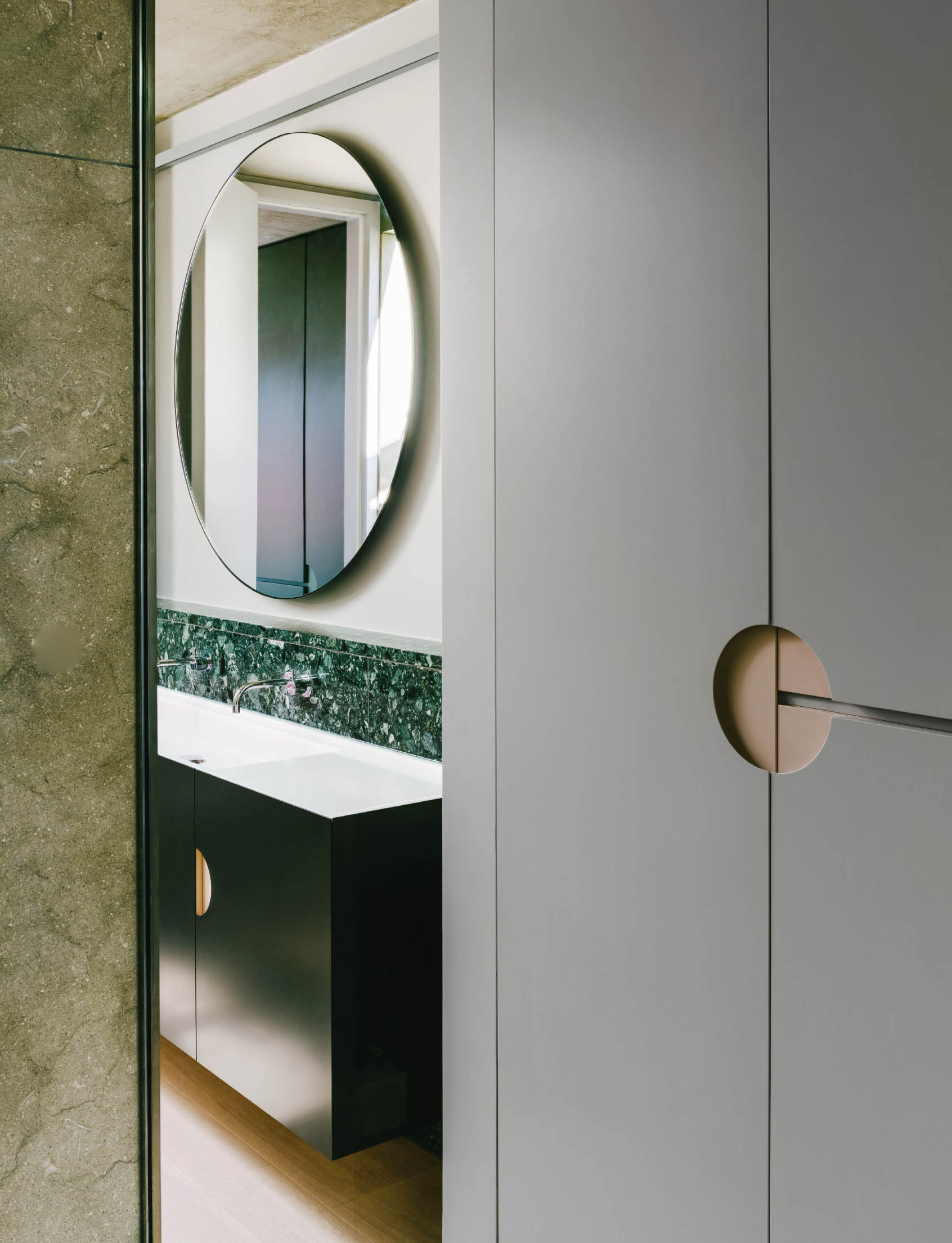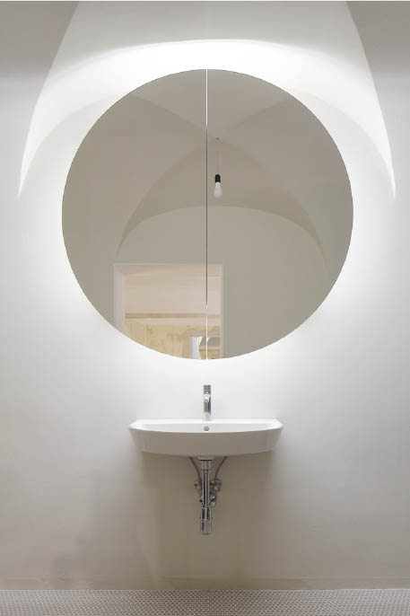 Ein Blick ins Badezimmer auf der rückwärtigen Seite der Box. Als grafisches Element dient hier der Kreis, der sich in Spiegel und den Türgriffen wiederholt.