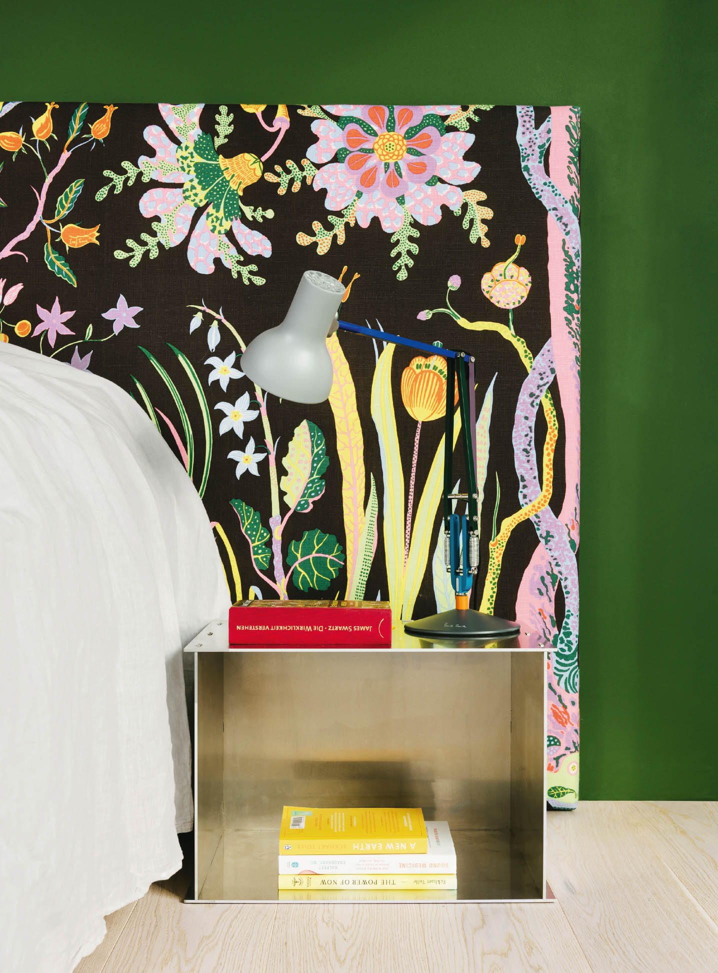 Das Kopfteil des Bettes ist ein wahres Kunstwerk. Sein Bezugsstoff wurde nach einem Entwurf aus den 1940er-Jahren des Architekten Josef Frank gefertigt.