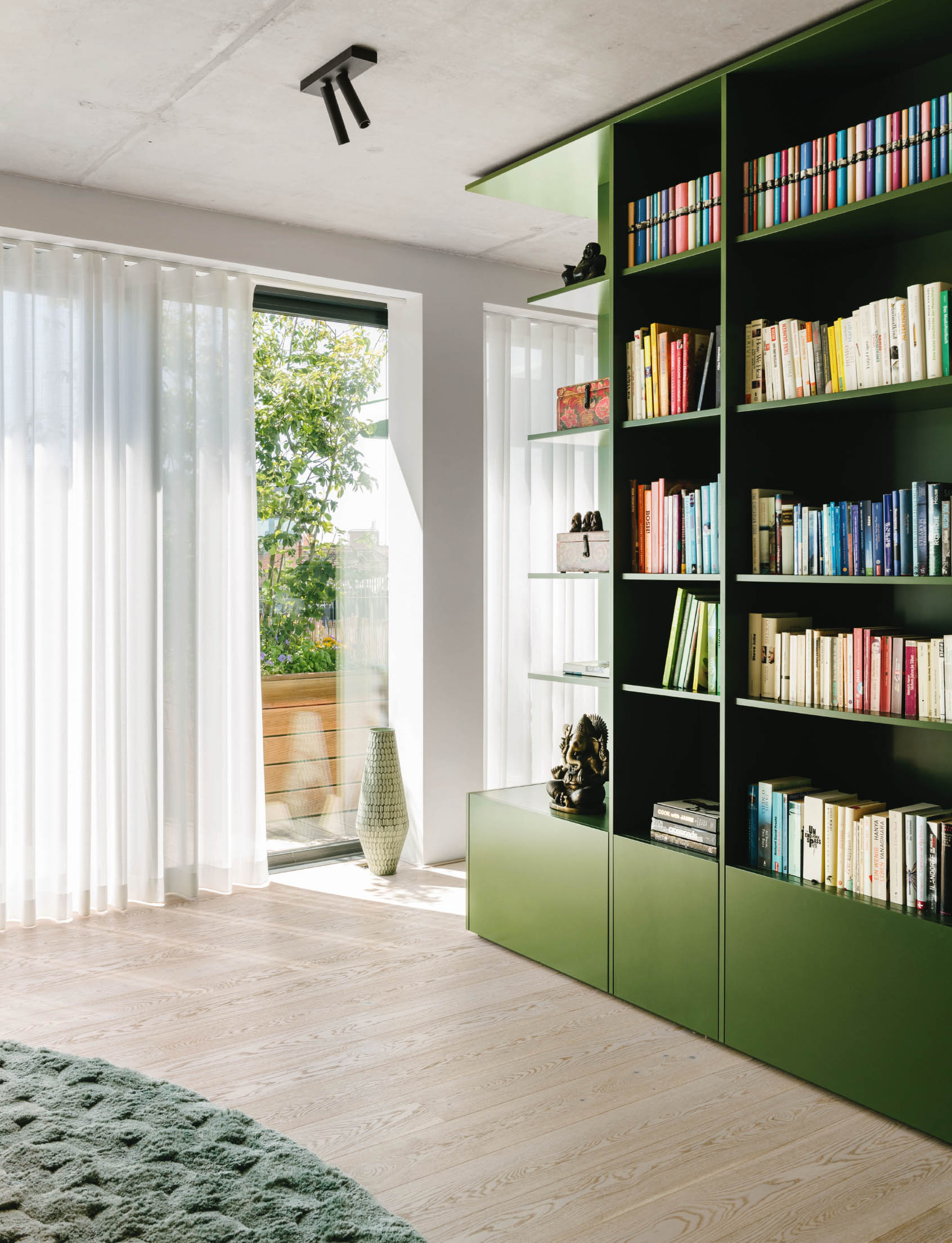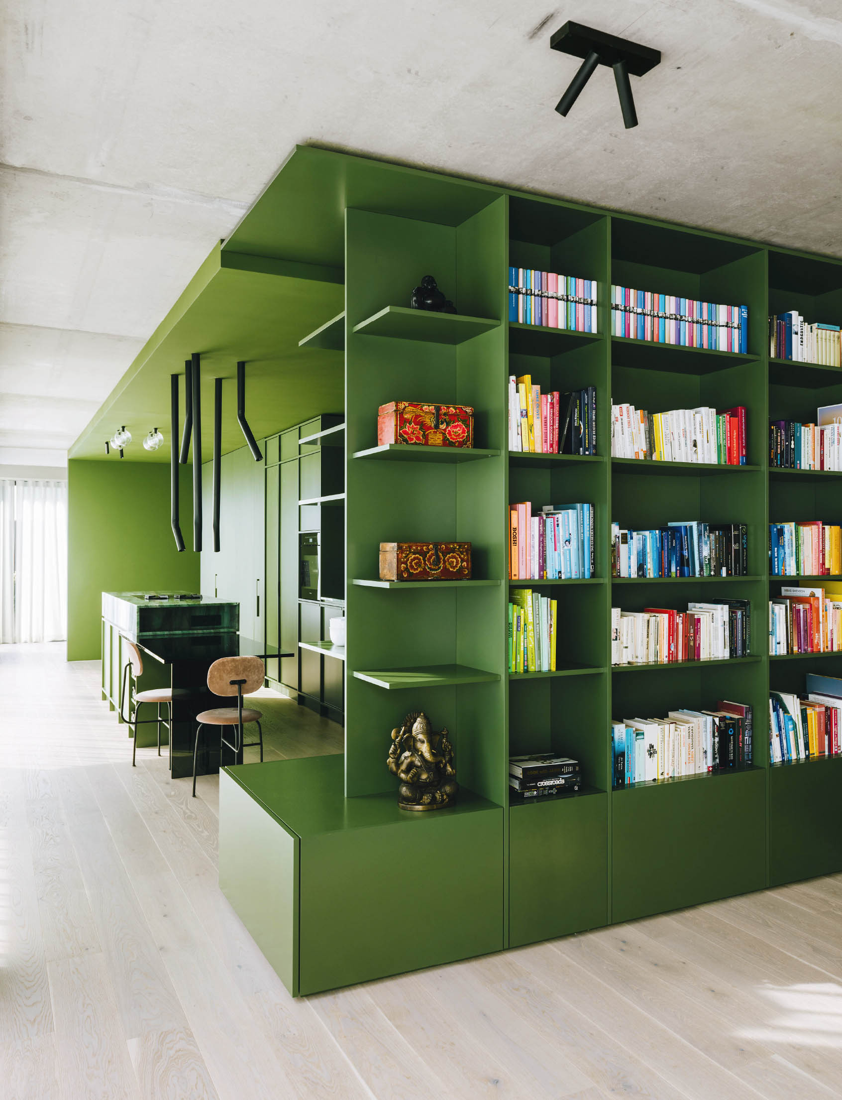 Die äußere Hülle der Green Box dient zugleich als Hausbibliothek. Der kleine Abstand zur Decke macht das Konzept deutlich, den Raum als Ganzes wahrnehmen zu können.