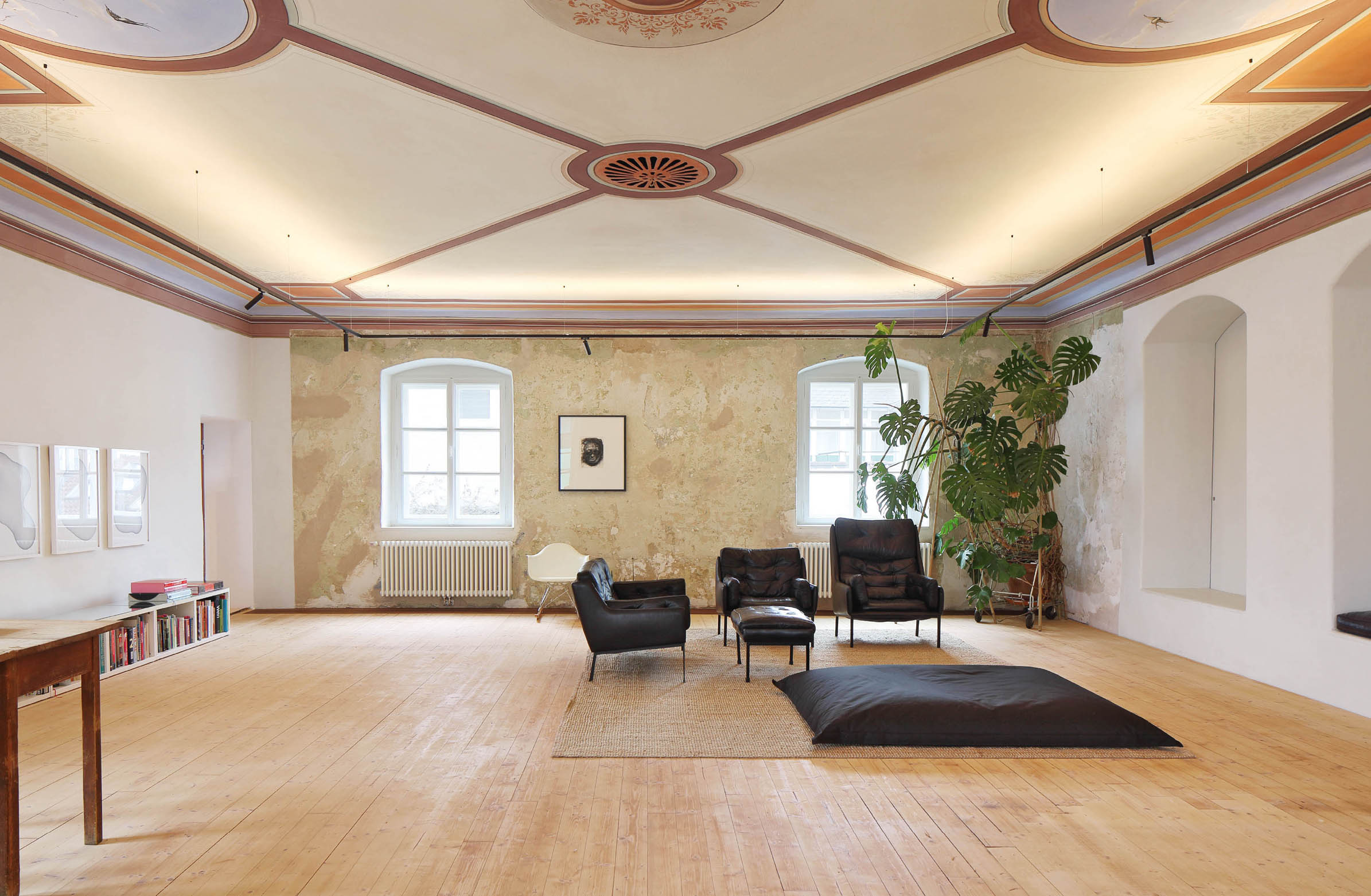 Unter der historischen, authentisch wiederhergestellten Wirtshausdecke aus dem Neobarock findet heute modernes Familienleben statt. Inspiration für die roh belassenen Wände lieferten den Bauherren italienische Palazzi.