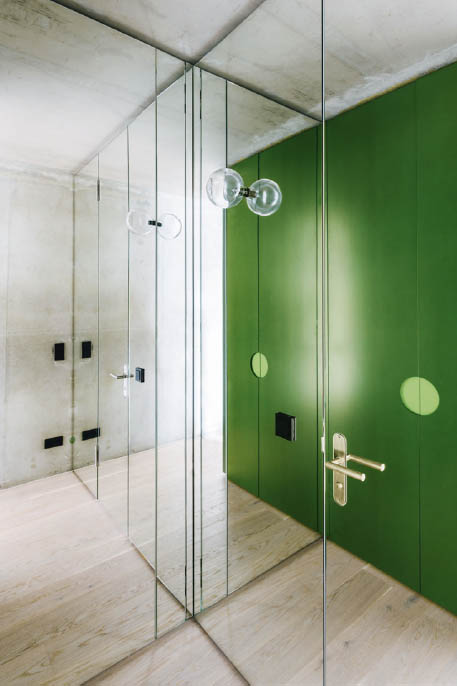 Der Eingangsbereich hat sich mit Wänden und Decke aus Sichtbeton seine coole Anmutung bewahrt. Verspiegelte Flächen reflektieren das raumbestimmende Grün, der helle Eichenboden schafft Wohnlichkeit.