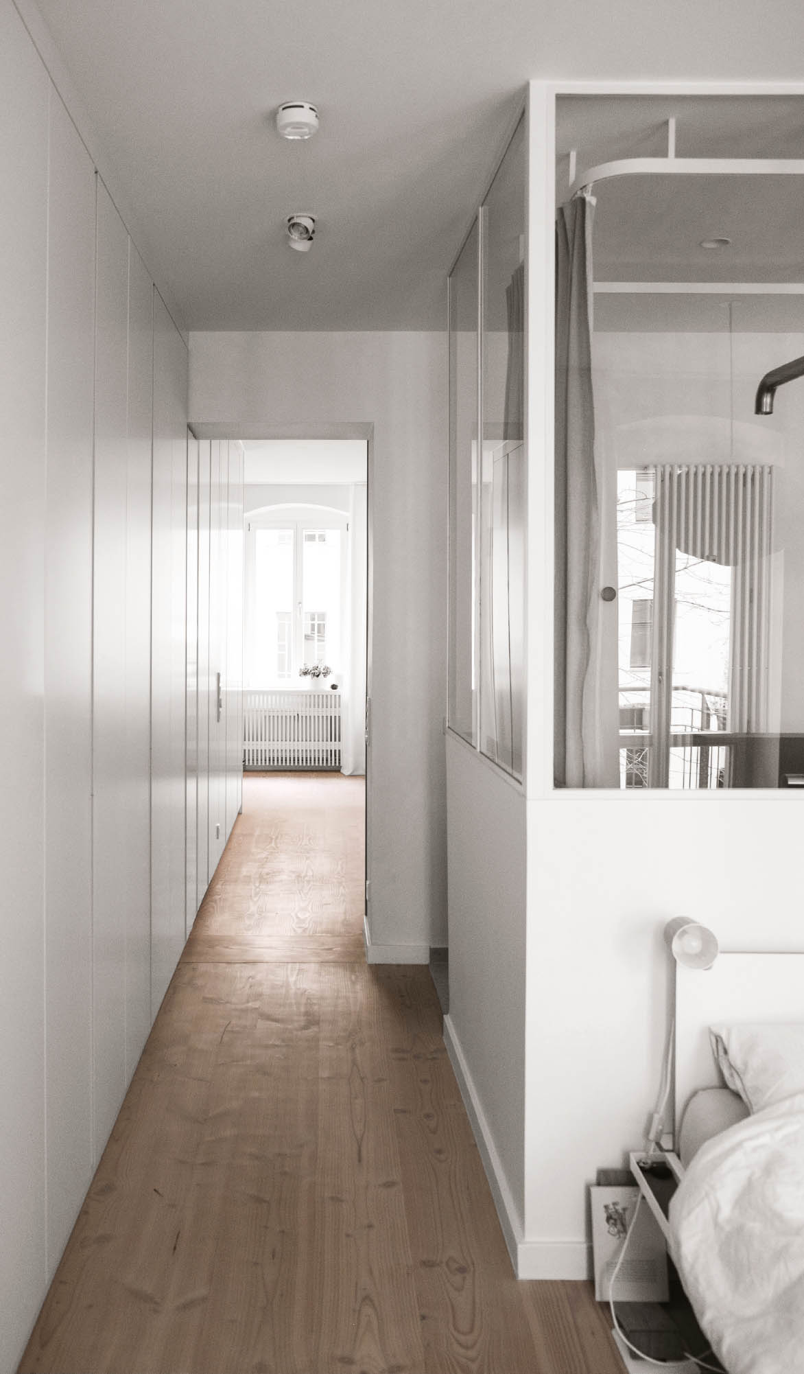 Mit einer Glaswand zum Schlafzimmer zieht Transparenz ins Badezimmer, während der Duschvorhang beim Gang unter die Brause für Intimität sorgt.