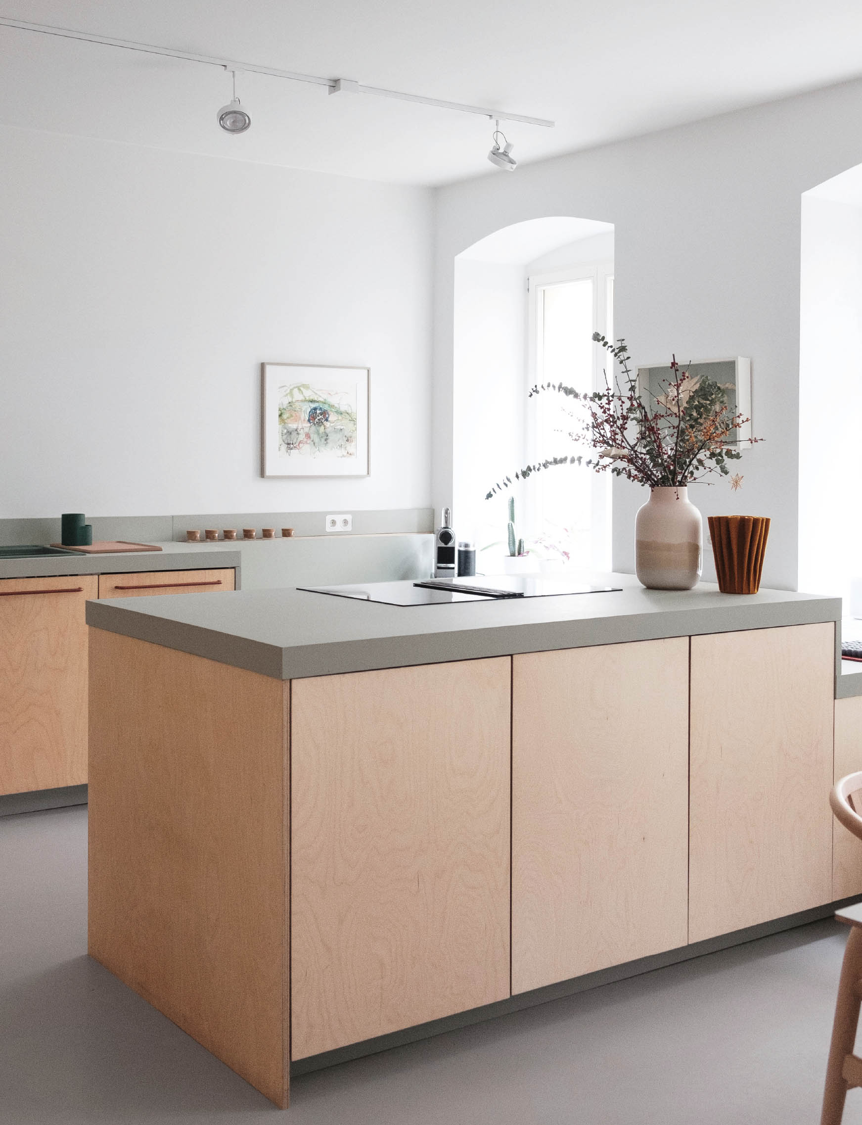 Auch die Küche unterstützt den Wunsch nach viel Licht und Luftigkeit. Daher wurde auf Oberschränke genauso verzichtet wie auf eine Abzugshaube. Dampf wird daher direkt am Kochfeld abgezogen.