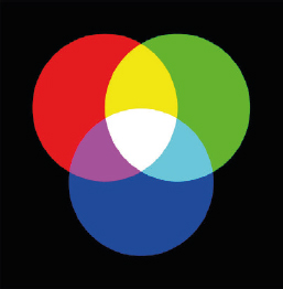 En este diagrama se pueden observar los tres colores primarios luz y sus mezclas. En el centro, la mezcla de los tres, que es luz blanca