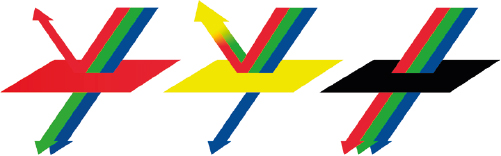 • Superponiendo filtros coloreados sobre un fondo blanco: si visualizamos una pared blanca a través de un filtro de color, las ondas luminosas se restarán. El blanco contiene todas las ondas luminosas, de forma que al pasar a través de los filtros hasta la retina, pierde las ondas luminosas que no dejan pasar el filtro. Si se superponen más filtros, se irán perdiendo paulatinamente el resto de ondas hasta no llegar ninguna y ver negro.