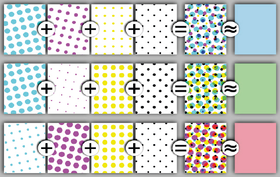 En la imprenta se emplea el sistema conocido como cuatricromía. No se imprimen puntos de cada color que existe, ya que sería inviable dado la gran cantidad de tintas diferentes que se tendría que tener, pues harían falta cientos de miles de colores diferentes para poder imprimir una fotografía. En lugar de esto, se imprimen solo cuatro colores: el cian, el magenta, el amarillo y el negro. Para imprimir una fotografía, primero se imprime la componente cian de ese color, después la componente magenta, después la componente amarilla y finalmente la componente negra. Cada pasada de tinta no se hace de forma plana, cubriendo toda la hoja, sino que se hace en forma de trama de círculos. La trama de cada color tiene una inclinación diferente C=75°, M=105°, Y=9°, K=45°, de forma que nunca se superponen totalmente. Los ángulos del amarillo y el cian pueden intercambiarse de ser necesario. Además, cada círculo de la trama puede tener un diámetro diferente para poder construir más matices de color. La suma de las cuatro tramas hace que el cerebro interprete los miles de colores que cree estar viendo.