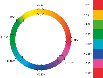 El tono se suele representar sobre un círculo, ya que la variación que se produce entre cada uno de ellos es cíclica. Así, para definir un tono concreto se puede usar un número de ángulo. Los programas de Adobe le asignan al rojo puro el ángulo 0°, así como el 360°. Al resto de colores le asigna un número de ángulo diferente. Aunque esta distribución es arbitraria, será la que se use en este libro para simplificar la terminología.