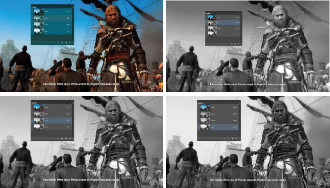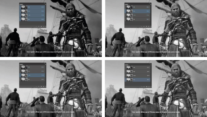 Imágenes de Assassin’s Creed IV: Black Flag. Copyright Ubisoft (2013) con los tres canales activos: canal rojo, verde y azul respectivamente