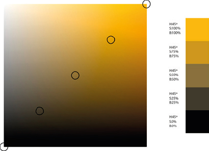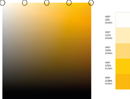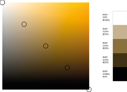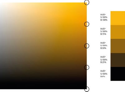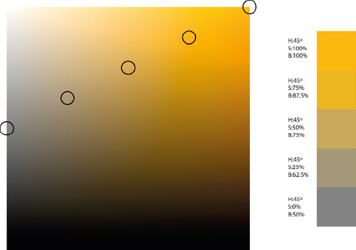 Una escala de color que fuese del blanco al negro se consigue al moverse en el cuadro de matices del color desde la esquina superior izquierda por la diagonal, hacia la derecha. Así, a la vez que se disminuye la luminosidad, se aumenta la saturación. De otro modo, se obtendría una escala de grises, sin ningún color.