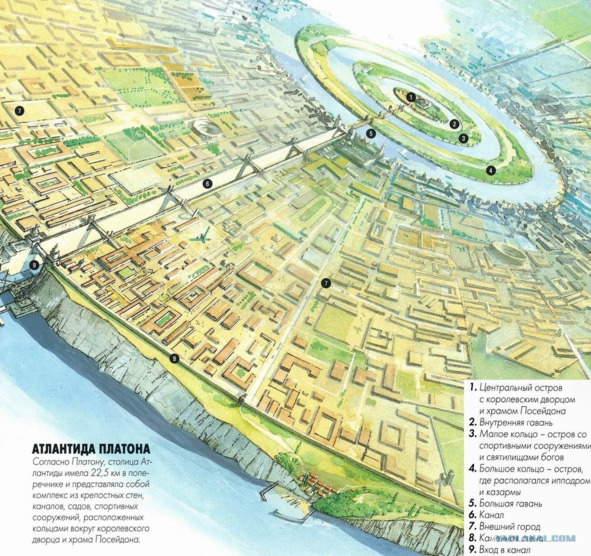 Но позвольте: не смеется ли над нами уважаемый философ? Какую дерзость и сказочное воображение надо иметь, чтобы так детально описывать Атлантиду через девять тысячелетий (!) после ее исчезновения? Но если предположить, что это мистификация – только предположить – то, надо сказать, она была неплохо подготовлена: «У Платона уже был материал, который он, вероятно, держал в уме, работая над „Тимеем“ и „Критием“. Вот сведения, которые Платону были, несомненно, известны. Описание Геродотом великолепия Вавилона с „висячими садами“ Семирамиды. В столице Мидии Эктабане имелось семь кольцевых стен с проложенными сквозь них туннелями. В Карфагене существовала круглая гавань, окруженная доками, а на центральном острове гавани располагалась „штаб-квартира“ карфагенского флота» (из книги Стивена Кершоу «Путеводитель по греческой мифологии», Москва, «АСТ», 2010 г.).