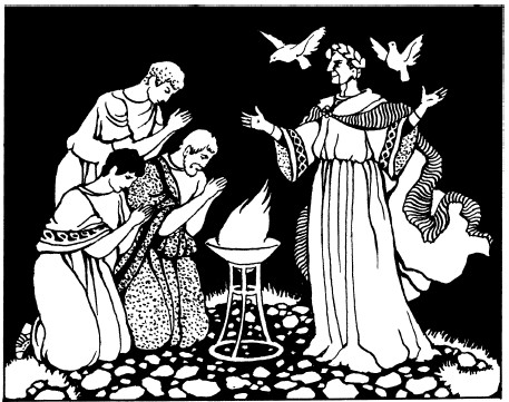 Незадолго перед тем, на закате дня, окружающие спросили императора, согласится ли он на то, чтобы ему воздвигнули храм на священной горе Рима. Но Август не сразу дал свое согласие. Он не знал, угодно ли будет богам, если ему воздвигнут храм наравне с ними, и решил раньше принести жертву своему духу-покровителю, чтобы узнать его волю. И вот он, в сопровождении нескольких приближенных, отправился совершать это жертвоприношение.