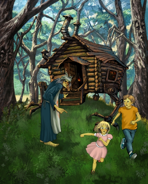 Дети побежали дальше, пока не очутились на поляне. В центре её возвышался дом из чёрного дерева. Из трубы валил чёрный дым. Держался дом на двух лапах, пальцы которых заканчивались изогнутыми жёлтыми когтями.