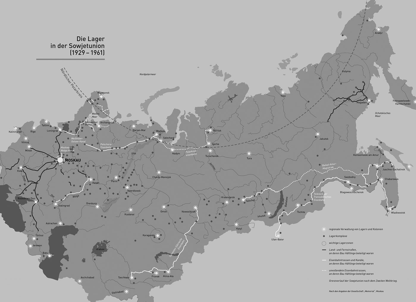Свой труд Шлёгель посвятил «стойким мемориальцам». В 2012 году благодаря выставке «ГУЛАГ. Следы и свидетельства 1929–1956» (подготовленной совместно с фондом мемориальных комплексов Бухенвальд и Миттельбау-Дора под патронажем Хорхе Семпруна и осуществленной после его смерти) об этих стойких мемориальцах узнала широкая немецкая публика. Выставка была показана сначала в Нойхарденберге, затем в веймарском музее Шиллера, а в 2013 году – в берлинском Немецком историческом музее43. В Веймаре выставка сопровождалась чтением отрывков из «Колымских рассказов» Варлама Шаламова, представленных в анонсе как «принадлежащие к важнейшим текстам о ГУЛАГе наряду с произведениями Александра Солженицына». В 2007 году издано полное собрание рассказов Шаламова, до этого выходивших по-немецки выборочно в 1967 и 1983 годах44. (Насколько широкой аудитории достигли доверенные Коринне Харфух веймарские чтения, остается неясным.)