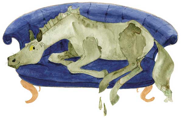 Фазанчик не успел договорить, как входная дверь с треском распахнулась и в гостиную прошествовала мутно-зелёная лошадь с длинным изумрудным хвостом. Копыта её были обуты в чёрные ракушки, а с гривы капала вода. Лошадь церемонно поклонилась хозяйке дома, после чего остановилась возле обеденного стола и забулькала. Через несколько секунд её сменило нечто бесформенное, напоминавшее лягушку с жёлтыми глазами. Лапы существа были по-прежнему обуты в ракушки.