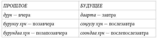 Логика понимания будущего выстраивается соответственно в противоположном порядке. Слово даарта образовано путем сращения слов в сочетании дац эрте (раньше первых лучей солнца, раньше зари) (Там же: 28, 85). Соцгузу хун означает день, который придет после завтрашнего дня, или день, идущий сзади завтрашнего дня. Соондаахун — день, грядущий или идущий позади послезавтрашнего дня.