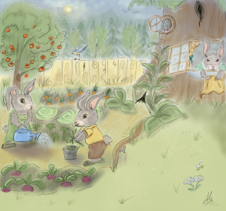 – Наверное, это Фуфик с Пуфиком! – Оживился Пушистик. Зайчата стали сильно торопиться, что бы скорее пойти к друзьям и вместо редиски Пушистик вырвал морковку, а Фантик вместо огурцов полил грядку с помидорами, которую до этого уже полил папа.
