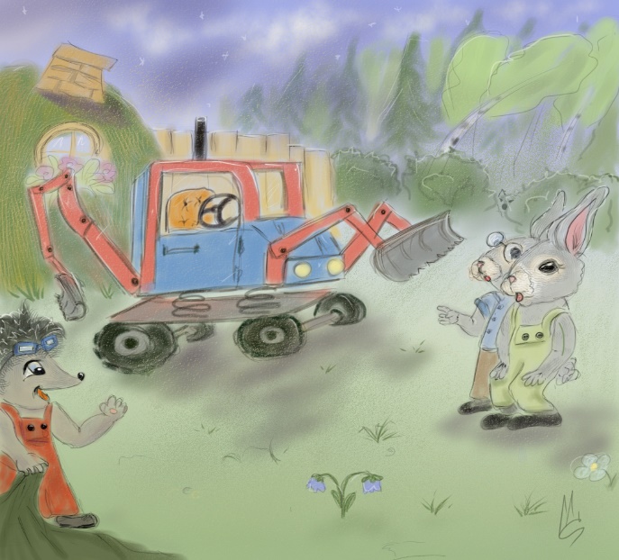 Сон как рукой сняло! Весёлая толпа друзей побежала в сторону дома ежат. Закрытый ветками и листьями под брезентом стоял собранный ежатами красно – синий экскаватор. Что это была за машина! Восхищению зайчат не было предела. Недавно покрашенная блестящая кабина соединялась с гусеничным ходом поворотным механизмом. Стрела экскаватора крепилась к ковшу, который был сделан из половины бочки. К переду кабины присоединялся бульдозерный щит, сделанный из другой половины бочки.