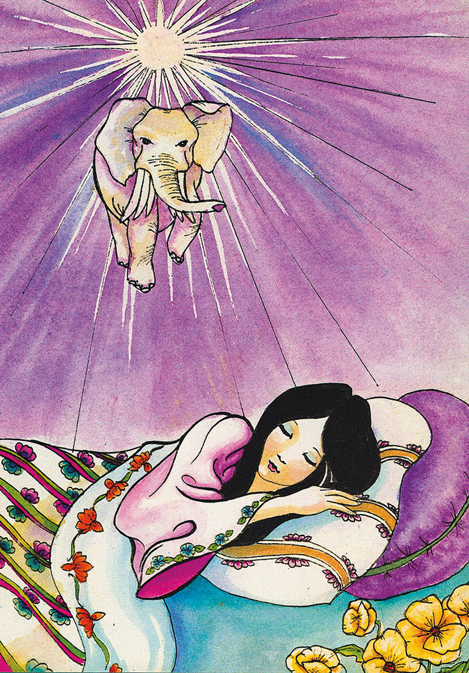 Много лет назад в маленьком королевстве на севере Индии произошли события, которым предстояло изменить весь мир. Королеве Майе, жене доброго короля Шуддходаны, приснился чудесный сон. Во сне на неё с небес струился искрящийся белый свет, и в его лучах она увидела великолепного белоснежного слона с шестью большими бивнями. Лучезарный слон подлетал всё ближе и ближе к королеве, пока наконец не влился в её тело. Майя проснулась, наполненная величайшим счастьем, какого никогда раньше не испытывала.