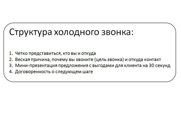 У холодного звонка есть четкая структура – необходимо четко представиться кто вы и откуда, обязательно должна озвучиваться причина звонка, выгода для клиента уделить внимание вашему предложению, мини-презентация на одну-две фразы (не более чем на 30 секунд) и договоренность о следующем шаге.