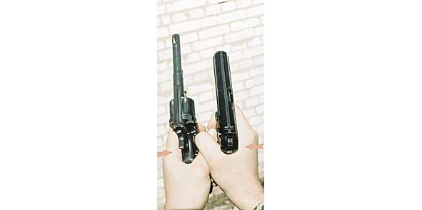 См.: «Боевая концепция одновременной стрельбы из двух стволов по одному в каждой руке появилась в семидесятых годах девятнадцатого столетия. Она стала результатом изобретения пяти-шестизарядных самовзводных револьверов Смит и Вессон, предназначенных для вооружения оперсостава полиции, жандармерии и прочих спецслужб того времени. Появление нового скоростного оружия и его возросшие технические характеристики сразу же повлекли за собой возникновение новых приёмов стрельбы и, соответственно, изменение в боевой тактике. Сейчас уже никто не помнит, как появился термин „стрельба по-македонски“, но эта боевая методика, резко увеличивающая огневую мощь конкретного стрелка на коротких дистанциях оперативного боестолкновения, оказалась очень удачной. Настолько удачной, что до сих пор культивируется в оперативно-боевом применении антитеррористических подразделений многих стран мира. Загадочная и обросшая мифами техника стрельбы по-македонски на самом деле довольно проста. Методика стрельбы из одного пистолета с удержанием его двумя руками в „треугольнике“ была известна довольно давно. С появлением самовзводных многозарядных револьверов отпала необходимость взводить курок перед каждым выстрелом – для этого стало достаточным просто посильнее нажать на спуск, и всё остальное самовзводный механизм оружия делал сам. Стрелки получали возможность взять второй револьвер во вторую, ничем не занятую руку, плотно прижать обе руки с зажатыми в них револьверами друг к другу, и после этого обрушить на противника лавину свинца сразу из обоих стволов. Этот простой приём в своё время произвёл в оперативно-боевой практике настоящую революцию. Чтобы всё это получалось лучше, большие пальцы рук, удерживающих оружие, плотно захватываются один за другой. Это называется „македонский захват“. Оружие ориентируется на цель стволами, поставленными параллельно друг другу. При этом образуется классический современный стрелковый треугольник, но уже с двумя стволами. Стрелять „по-македонски“ можно хоть из двух револьверов (пистолетов) залпом одновременно, хоть порознь и поочерёдно, выстреливая один боекомплект за другим. В любом случае преимущества боевой работы из двух стволов очевидны. Если стрелять даже из одного пистолета, но удерживая две единицы оружия „по-македонски“, то такая стрельба по особо важной „точечной“ цели получится гораздо скорострельнее и результативнее. Причиной тому является не только удержание оружия усилиями двух рук, но и то, что дополнительная масса „нерабочего“ в момент стрельбы пистолета не позволяет стреляющему стволу „сдерживаться“ в момент спуска курка и чрезмерно „сбиваться“ при отдаче после выстрела».