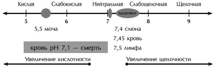 Оптимальный уровень кислотно-щелочного баланса (рН) крови человека равен 7,35-7,45. Если он уменьшается, значит, в организме происходит закисление, если увеличивается – ощелачивание. Если рН крови падает ниже 6,8, то человек умирает.