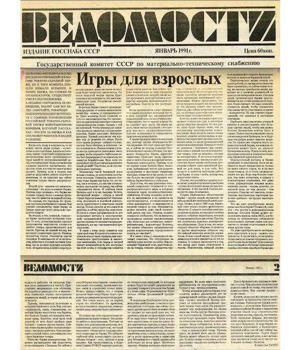 У наших брокеров такого класса пока нет, поэтому сделки обсуждаются более вдумчиво. Но опыт приходит быстро, и сейчас во втором подъезде Политехнического музея в Москве, где временно базируется биржа, нарастает оживление. Приходят люди, приехавшие со всего Союза и желающие начать биржевую деятельность. Причем, если на первых порах было больше «ходоков», выбивающих что-то для родного предприятия и мыслящих терминами «фонды», «лимиты» и так далее, то сейчас больше желающих открывать что-нибудь «биржеобразное» у себя дома.