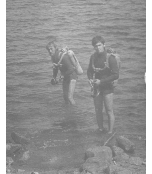 Владислав Ларин и Владимир-аквалангист, первое погружение на острове Большой Утриш, идём на 27 метров, август 1982 г.