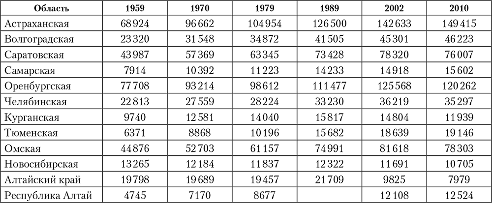 Таблица 2. Численность казахов, проживающих в пограничных с Казахстаном областях России по переписям 1959–2010 гг.