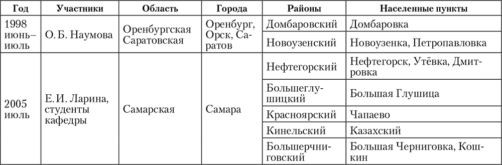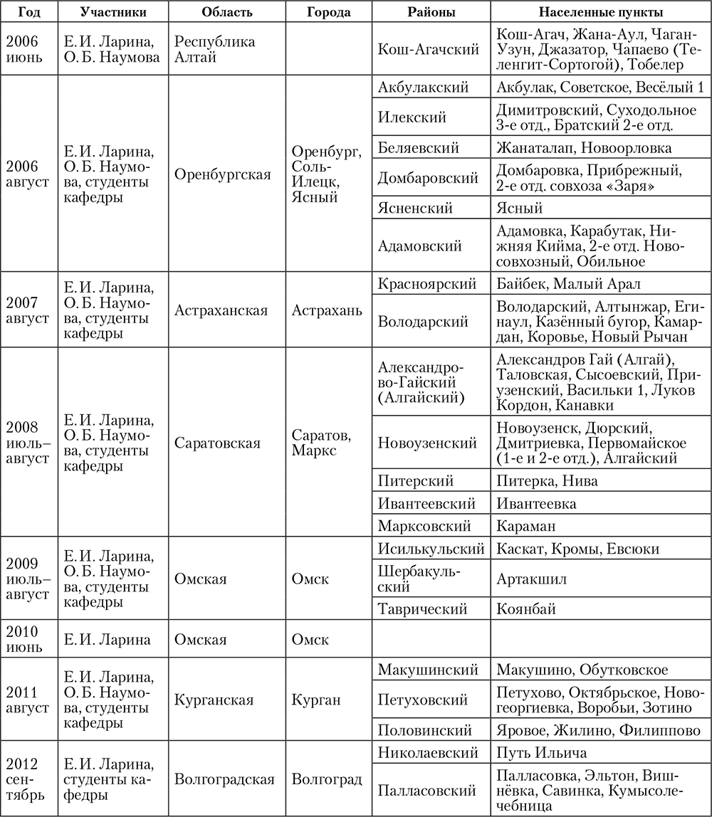 В 1998, 2005–2012 гг. вместе и по отдельности мы вели полевые работы в местах расселения российских казахов. Наше исследование охватило большую часть территории с компактным проживанием казахов вдоль российско-казахстанской границы: в Астраханской, Волгоградской, Саратовской, Оренбургской, Курганской, Омской областях, а также в Кош-Агачском р-не Республики Алтай.