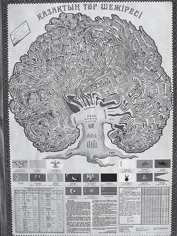 Миграционные трансграничные обмены дали начало еще одному новому для рос сийских казахов явлению. Пятнадцать лет назад все они, за исключением, пожалуй, алтайских казахов, плохо ориентировались в казахских родовых делениях. Как правило, они знали, к какому ру принадлежат, однако не представляли себе родоплеменную структуру в целом, равно как и место своего рода в этой системе (Наумова 2000: 62). Теперь же поездки в Казахстан, где это знание, в советские времена не афишировавшееся, стало более открытым, доступным и актуальным, и общение с его носителями «у себя дома», т. е. с казахами-переселенцами из Казахстана, стали своего рода катализаторами стремления больше узнать о своем ру, выяснить имена предков до седьмого колена и т. д. Дополнительную роль играет тут «культуртрегерство» активистов казахских НКО в России: со всемирных казахских курултаев в Казахстане они привозят красочные плакаты с изображением шежере (родословной) казахов. Такие плакаты можно увидеть во многих казахских домах. Некоторые казахи не находят там своего ру, что и побуждает их к целенаправленному поиску «корней».