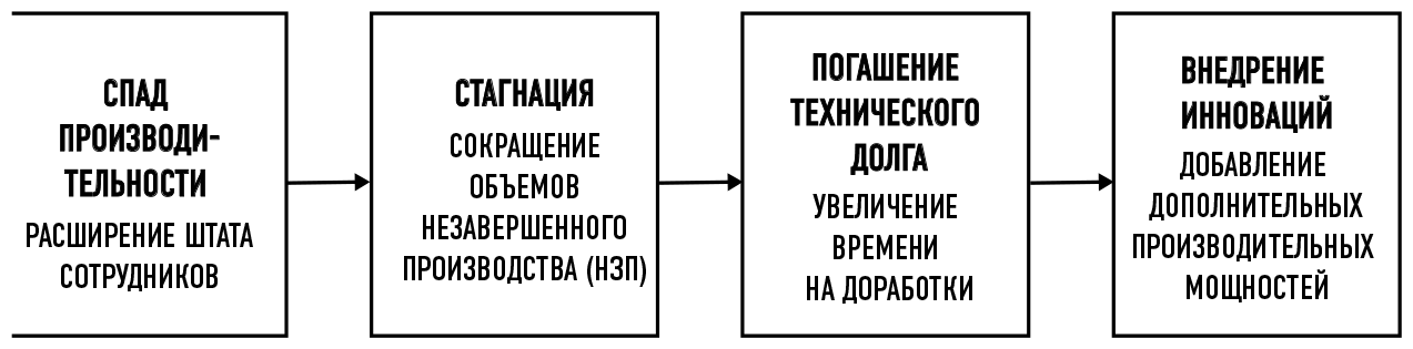 Погашение технического долга: все ресурсы уходят на техническое сопровождение, что провоцирует эффект «снежного кома». Каждая закрытая задача ведет к увеличению времени для погашения прочих долгов.