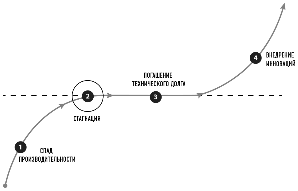 Стагнация: команда закрывает ключевые задачи, но не гасит технические долги и не приступает к новым крупным проектам. Моральный дух немного выше, но сотрудники по-прежнему работают на пределе, а заказчики могут казаться счастливее только от того, что поняли: никакие запросы ни к чему не приведут (поэтому они перестают выражать недовольство).
