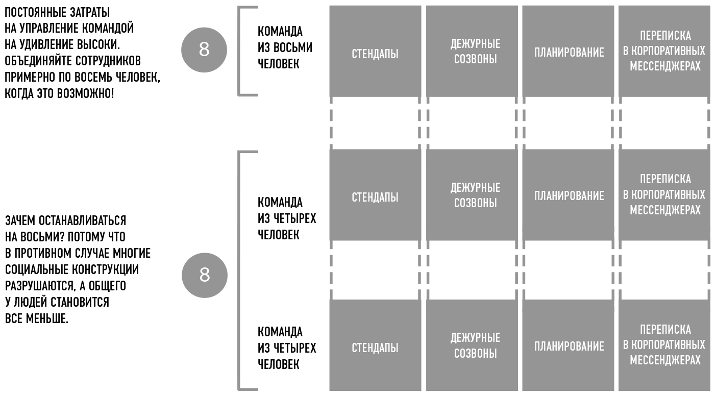 По своему опыту я вывел правило, что для нормальной ротации команде требуется восемь инженеров. Поэтому неохотно внедряю изменения в любую команду, в которой меньше восьми человек. Однако ситуации складываются разные: будь то усилия по предотвращению банкротства, достижение договоренностей до подписания контрактов, запросы на поддержку от других команд и т. д.