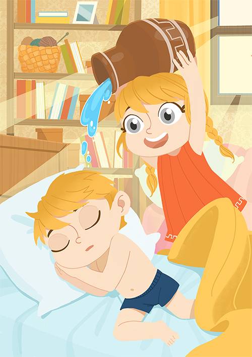 Недолго думая, она схватила глиняную вазу, вытащила из нее цветок, откинула одеяло и с криком: «Наводнение! Спасайся, кто может!» вылила всю воду на голову спящего брата.